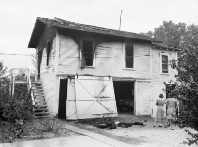 Image shows A garage apartment of Northwest Twentieth Street was engulfed in flames early Sunday. Dallas Johnson, a cattle buyer, was killed inside his apartment. Pictured is the charred exterior of the garage. Mr. Johnson's apartment was upstairs. The sliding garage doors are off the hinges and a group of women are standing in the driveway Published in the Fort Worth Star-Telegram evening edition August 25, 1941.