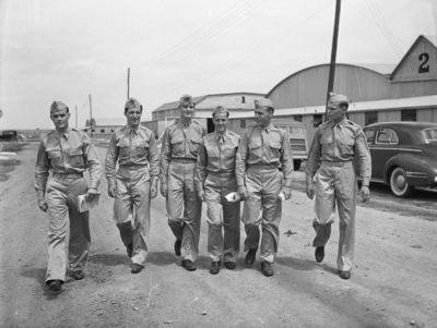 Hicks Field. West Pointers at Hicks Field. Left to right, Lanham C. Connally, McGregor; Fred J. Ascani, Rockford, Illinois, Frank E. Locke, Cleveland, Ohio; John W. Meadow Huntington, W. Virginia; Jack C. McClure, Dallas and Leon H; Berger, Calumet City, Illinois. Fort Worth Star-Telegram Evening Edition. 1941-08-21. Photograph of six male soldiers from West Point Military Academy. They are walking down a dirt road at Hicks Field. There are barracks in the background.