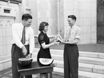 First Methodist Church is hosting a watermelon party. Inspecting some of the watermelons are, left to right, Curtis Thomas, Miss Maybell Criner, and Roy Rose. Mr. Thomas is cutting the watermelon. He is dressed in a collared shirt, necktie and trousers. Miss Criner is chairman of the ways and means committee. She is wearing a dark dress. She is shown offering a slice of the melon to Mr. Rose, the class president. He is dressed in a striped button-up shirt with cuffed sleeves, a necktie, and trousers.