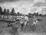 The gun crew of Battery C shelling crossroads north of Lewisville, Louisiana, during Army military maneuvers. Left to right, the crew members are Privates T. Snowden, of Mabank, Texas; Walter Miller, of Waco, Texas; Odis Thompson, of Gatesville, Texas; Dan Barnes and Bill Coffman, and Sergeant J. W. Lee, all of Lubbock, Texas. All the men are wearing their military uniforms and helmets. They are knelt down behind the machine gun, and appear to be taking aim. In the distance, more men can be seen doing the same thing.