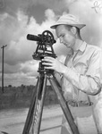 Sergeant A. F. Reese, of Shallowater, Texas, running an orientation line for the Battery. Sergeant Reese is the survey sergeant for the headquarters battery of the 1st Battalion of the 133rd Field Artillery. He is wearing an Army uniform and a brimmed hat. The orientation device is standing on a tripod.