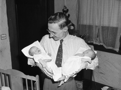Clyde M. DeVoll holding his twin daughters in each arm, Ronna Mae, left, and Donna Faye. The twins were born on August 19. DeVoll got the biggest applause as he graduated last Friday night, August 22 when the birth of his daughters was announced by President Law Sone of the Texas Wesleyan College at the commencement. Published in the Fort Worth Star-Telegram morning edition, August 29, 1941.