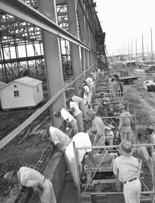 Walls of assembly building of the Lake Worth bomber plant rising as the brick-laying crews labor.