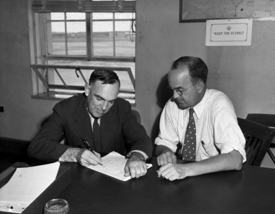 The United States Weather Bureau is assigning a new regional director to the Fort Worth, Texas, office. Pictured left to right are Erle Hardy and H. P. Adams. Mr. Hardy is the new director in charge of the district, which includes Texas, New Mexico, Oklahoma, Arkansas, and Louisiana. He is dressed in a dark suit. Mr. Adams, his predecessor, was assigned in the region for four years. His new post is in Philadelphia, Pennsylvania. He is wearing a striped shirt with cuffed sleeves and a necktie.