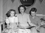 Mrs. J. B. Campbell with her daughter Beverly Ann, 6, and son, Bobby, 11. They left Sunday night to join Mr. Campbell in San Antonio, where he is a radio mechanic at Duncan Field and will make their home there at 1603 West Ashby Street. They are the daughter and grandchildren of Mr. and Mrs. W. W. Lamberth. They are all sitting on a couch and reading a book. Published in the Fort Worth Star-Telegram evening edition, September 2, 1941.