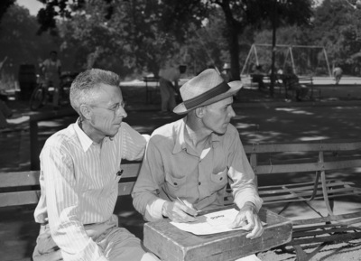 Roque Tournament. Left to right, Mr. I. R. Fitzgerald, National Association secretary from Wichita, Kansas and Mr. King Loughridge of Indianapolis, Indiana. Photograph of two men sitting on a bench outdoors in a park like setting. Both men are looking to the right. The man on the right has a briefcase on his lap and a mechanical pencil in his right hand. There is a sheet of paper on top of the briefcase that he is writing on. It appears he may be keeping score for a roque game they may be watching. Published September 1, 1941.