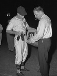Marc Beddingfield, player for the Fort Worth Cats, left, receiving a package from Bob Lucas during Fort Worth Cats Appreciation Night. On the side of the package are the words, "Ranch Style Beans," and 48 Cans." Beddingfield is holding two beverages in glass bottles in his right hand. Beddingfield is dressed in his baseball uniform while Lucas is wearing a long-sleeved, striped shirt and trousers. Lucas also has a cigar in his mouth.