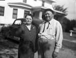 Mr. and Mrs. Walter Jones are owners of a farm near Reading, Kansas, where thousands of Texas-bred cattle have made their home. The couple are standing in front of their home. An automobile is parked in the background. Mrs. Jones is wearing a button-down dress and eyeglasses. Mr. Jones is wearing a long-sleeve shirt, trousers, suspenders and a hat.