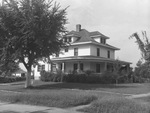 Exterior shot of the house of Mr. and Mrs. Walter Jones, owners of a farm near Reading, Kansas, where thousands of Texas-bred cattle have made their home. Shrubs line the perimeter of the house. There is a tree in the front yard. At the far left are two parked automobiles.