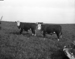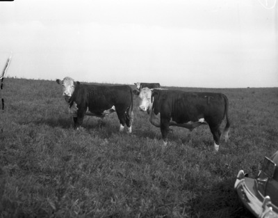 Typical steers in the feedlot of Walter Jones near Reading, Kansas. The steer on the left was from the McClellan Ranch near Lubbock, Texas, and the one at right is from the ranch of George Cleveland. Cleveland lives at Lubbock, Texas, but does his ranching near Plains, Texas. A third steer is standing in the background. The cattle are in a grassy field. At the far right, in the foreground, is an automobile (partially obscured). The steers are branded with a "T" symbol.