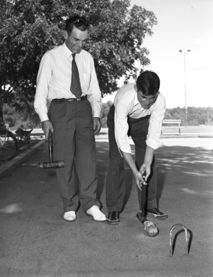 Roque Tournament. Left to right, Mr. Cullen Willis of Abilene, Texas and Mr. Wallace Martin of Waco, Texas. Photograph of two men posed in a squatting position. They are outdoors. Both are holding mallets and there are two balls in front of them. There is a small, metal, dome shaped arch in front of the balls. Published September 1, 1941.