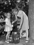Residents of Fort Worth, Texas, are spending Labor Day weekend relaxing and enjoying the outdoors. Spending a day at Forest Park, left to right, are Carol Brown and Miss Helen Reed. Miss Reed, of Decatur, Texas, is shown helping little Carol Brown to some home-made ice cream. Carol is wearing a checkered dress. Miss Reed is wearing a polka-dot dress. Several girls are enjoying the ice cream at a picnic table in the background.