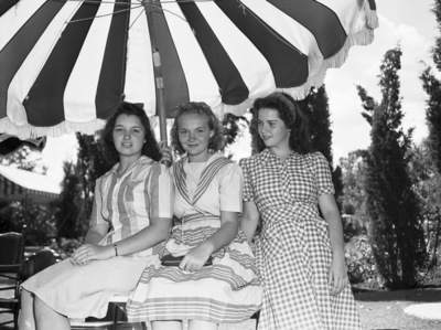 Miss Betty Lou Sewell, left, who is visiting Miss Peggy Garrett, center, and Miss Joyce Wilson, right. They guest is the daughter of Mr and Mrs. D. Clinton Sewell of San Antonio, Texas, formerly of Fort Worth, Texas. They are seated on an outdoor patio table under a striped umbrella. Miss Sewell is wearing a striped blouse and a skirt, Miss Garrett is wearing a striped dress and Miss Wilson is wearing a checkered dress.