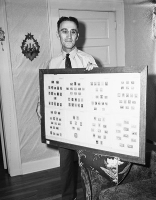 An unidentified man stands posed with his collection of Civil War revenue stamps. He plans to exhibit his stamp collection along with several others at the Panther City Philatelic Society at Blackstone Hotel. It is a nice collection. Published in Fort Worth Star-Telegram morning edition September 7, 1941.