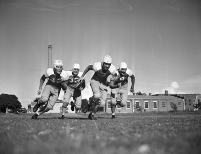 The Masonic Home High School football team is trying for their fourth straight district 7-AA Championship. Four little rascals from the 1940 season have grown into the husky, talented Masons backfield. Pictured, left to right, are Gordon Brown, Billy Joe Cagle, Louis Burress, and Dewitt Coulter. Brown (43), a fullback, was all-state in 1940. Cagle (33) is a wing-back. Burress (7) is a tailback. Coulter (8) is a blocking back. They are shown in a running formation, blocking for Cagle, who is carrying the ball. The school building is in the background. The one story brick buildings are in the foreground behind the boys with a tall smokestack behind them. There is also a black sedan in the background and a boy as bystander. "This Is What Masonic Home's 'Little Rascals' of Last Year Have Grown Into. TAKE A GOOD LOOK at these four husky youngsters. You're going to see plenty of them at Farrington Field the next three months as the Masonic Home Masons try for their fourth straight district 7-AA championship. Some critics think this big and talented Mason quartet, composed of FULLBACK GORDON BROWN, WINGBACK BILLY JOE CAGLE, TAILBBACK LOUIS BURRESS and BLOCKING BACK DEWITT COULTER, in left to right order, will be one of the State's top schoolboy backfields before the season is over. Brown was all-state last year, Burress saw some service and both Cagle and Coulter were regular linemen." Star-Telegram Photo, Star-Telegram Eve, Sep 3, 1941.