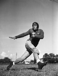 Raul Manriquez is a speedy back on the Texas Wesleyan Rams' college football team. The 153-pound player has been nicknamed the "Speed Merchant". He has already scored a touchdown this season and looks to find the end zone again in the upcoming game against McMurry University in Abilene, Texas. Manriquez is shown running the football in practice. "(Star-Telegram Photo.)" Published Star-Telegram Eve. Oct. 10, 1941.