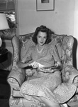 Miss Mary Hope McCammon announced the date of her upcoming wedding to Ned Jones. The couple plans to marry on September 27, 1941. Miss McCammon is shown sitting on a chair, reading a magazine. She is wearing a dress, with a small sailboat pattern, and a beaded necklace. She is the daughter of Mr. and Mrs. Y. Q. McCammon. Published Fort Worth Star-Telegram Morning Edition September 7, 1941.