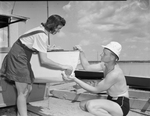 Expert sailors from all over the nation are flocking to Eagle Mountain Lake of the ninth annual regatta of the International Snipe Association. Mr. and Mrs. Max Lauderback are shown cleaning their boat after the 1,500 mile trip to Fort Worth, Texas. Mr. and Mrs. Lauderback are the champions of the Detroit River Fleet. Mrs. Lauderback is wearing a striped blouse and a jumper. Mr. Lauderback is dressed in a floppy hat and swimming trunks.