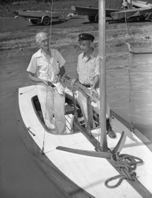 Expert sailors from all over the nation are flocking to Eagle Mountain Lake of the ninth annual regatta of the International Snipe Association. Traveling all the way from the Olcutt Yacht Club in Lockport, New York, left to right, are Dr. Frank J. Moyer Junior and Harry Shaeffer. They are shown in the water, aboard their sailboat, "Scat." At 60 years old, Dr. Moyer is among the oldest sailors on Lake Ontario. He is dressed in a short-sleeve shirt and trousers. Mr. Shaeffer is wearing a peaked hat, button-up shirt, and trousers. There are boats hitched onto trailers in the background.