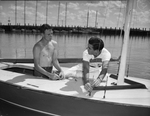 Expert sailors from all over the nation are flocking to Eagle Mountain Lake of the ninth annual regatta of the International Snipe Association. Representing the Western Long Island Sound Fleet, left to right, are Jack Baird and Bill Dowd of Larchmont, New York. They are shown checking the rigging of their sailboat. Mr. Baird is dressed in trousers. Mr. Dowd is wearing a striped shirt and white trousers. Boats are docked in the background.