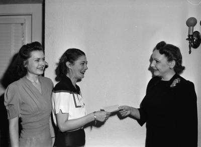 Waitresses from the Worth and Westbrook Hotels are taking a four week course on the finer points of serving gourmet foods. The course is sponsored by the State Vocational Education Department and the University of Texas. Practicing their winning smiles, left to right, are Mrs. Mavonne Mayberry, Miss Mattie Mae Alsobrook, and Mrs. Edna Waits. Mrs. Mayberry and Miss Alsobrook are receiving certificates from Mrs. Waits. Mrs. Mayberry, of the Westbrook Hotel, is wearing a dress. Miss Alsobrook is from the Worth Hotel. She is wearing a button-up blouse and a skirt. Mrs. Waits is an instructor from the University of Texas. She is wearing a dark dress with a brooch.