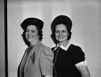 Waitresses from the Worth and Westbrook Hotels are taking a four week course on the finer points of serving gourmet foods. The course is sponsored by the State Vocational Education Department and the University of Texas. Practicing their winning smiles, left to right, are Mrs. Lola Smith and Mrs. Ruby Purser. They were each named the most efficient waitresses at their respective hotels. Mrs. Smith, of the Westbrook Hotel, is wearing a hat, blouse, and a checkered blazer. Mrs. Purser, of the Worth Hotel, is wearing a hat and a button-up blouse with floral embroidery detailing on the collar and sleeves.