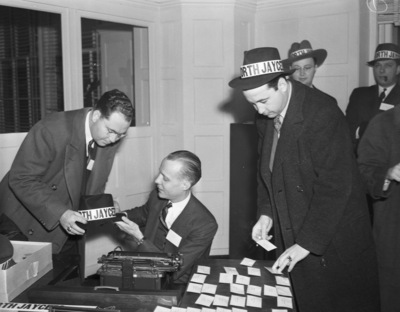 The Southwestern Exposition and Fat Stock Show are getting some advance publicity with their Goodwill Tour. Preparing for the trip left to right are Truett Mann, Howard Colling, at the desk, and Allen Bergman. Mr. Colling is handing out hatbands and name plates to the travelers. He is dressed in a three piece suit. Mr. Mann is wearing a double breasted suit. Mr. Bergman is dressed in a hat, suit, and coat. There is a typewriter on the desk and a crowd in the background.