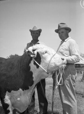 The thirteenth annual Throckmorton County Fair and Rodeo is opening Wednesday morning. Left to right are, Joe McCluskey and Wilson Nicholas. They are posing with "E. N. McCluskey," the grand champion Hereford bull. They are herdsman for the McCluskey Cattle Company, who showed the bull. Mr. McCluskey is wearing a cowboy hat, button-up shirt, and trousers. Mr. Nicholas is dressed in a hat, striped shirt, and trousers.