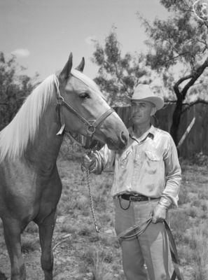 The thirteenth annual Throckmorton County Fair and Rodeo is opening Wednesday morning. W. R. Cooper is posing with "Prisoner." Mr. Cooper is a rancher in Throckmorton County, Texas. He is dressed in a cowboy hat, button-up shirt, and trousers. He is holding the lead rope of his horse. Prisoner is a seventeen month old Palomino stallion. He is the grand champion Palomino of the Horse Show.