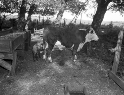 Shot of a yearling from the Raymond Bell ranches in West Texas which is being fed on the R. T. Hamilton stock farm near Iowa Falls, Iowa. The Corn Belt states constitute the biggest market for Texas-bred calves. The cow is standing in a fenced-in area. At the far left is a feeding trough. Beside the yearling is a pig, facing away from the camera.