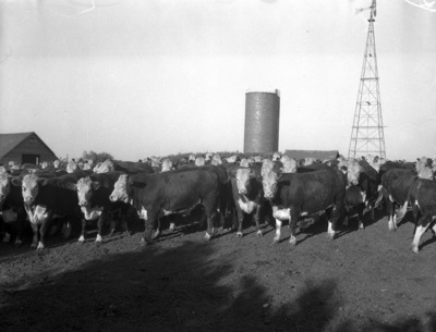 Some of the cattle bred by Raymond Bell, West Texas and Mexico cattleman, on feed by R. T. Hamilton in a feedlot near Iowa Falls, Iowa. In the background is a farmhouse (left), a silo (center) and a windmill (right).
