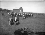 These steers, from the Bevins Estate in Amarillo, Texas, were acquired by Wayne Dolmage, of Victor, Iowa. They are shown on the Dolmage feedlot. There is a barn in the background as well as several corn crops.
