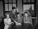 Officers of the Burton Class of Central Methodist Church discuss plans for "Victory Visit Day," September 14, when many Fort Worth, Texas, churches will be host to Camp Wolters soldiers. The officers are, left to right, Mrs. Loutitia Armstrong, president; Worley Jones, chairman of the "Victory Visit" committee; Lanier Morris, vice president; and Mrs. Tommie Blair, secretary. Mrs. Armstrong, Mr. Morris and Mrs. Blair are seated at a wooden table while Mr. Lanier stands behind Mr. Morris. Mr. Lanier appears to be pointing out something on a paper that is placed in front of Mr. Morris. Mrs. Armstrong is wearing a short-sleeved, light colored dress, a plaid print hair scarf and a cross necklace. Mrs. Blair is wearing a polka-dotted dress and a woven hat. The men are both wearing dark suits. Behind them are two windows.