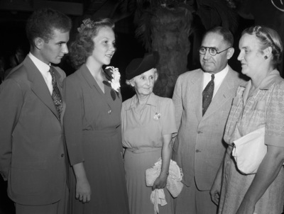 Among those attending the Exchange Club's first dinner-dance in honor of the club members' children were, left to right, Rufus Garrett Junior, Miss Nellie Thomas, Mrs. A. F. Townsend, and Mr. and Mrs. Rufus Garrett Senior. The men are dressed in dark suits and patterned ties and Mr. Garrett Senior is wearing eyeglasses. Miss Thomas is wearing a long-sleeve, dark dress with a flower adorned on her shoulder, while Mrs. Townsend and Mrs. Garrett Senior are wearing short-sleeve, light-colored dresses. Mrs. Townsend and Mrs. Garrett Senior are also carrying handbags and Mrs. Townsend is wearing a dark hat. Rufus Garrett Junior and Miss Thomas were co-chairmen of the entertainment program for the event. Miss Thomas is the daughter of the president of the Exchange Club. Mrs. Townsend is the wife of the originator of the dinner-dance. The event was held at the Lake Worth Casino.