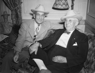 Lieutenant Colonel T. W. Blackburn, left, of March Field, California, and Brevet Lieutenant General John A. Hulen, retired, who reunited in Fort Worth, Texas. Colonel Blackburn was a major instructing the 111th Observation Squadron at Houston, Texas, when it was part of the Texas National Guard (36th Division) commanded by General Hulen. Blackburn is president of the site board for the Fourth Air Force, Combat Command. The two officers are sitting on a couch, both wearing suits and Shady Oak hats. Blackburn is wearing a necktie and Hulen is wearing a bow tie and eyeglasses.