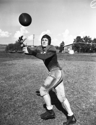 Kenneth Moore is a football player on the Texas Wesleyan Rams' college football team. The former Paschal High School athlete is a native of Fort Worth, Texas. He is one of the many Fort Worth boys trying for places on the team. Moore weighs 200-pounds and is an excellent pass receiver. He should see service at left wing this season. Moore is shown running a pattern and extending his arms to catch a pass in practice.