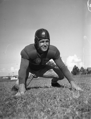 James Zachary is a football player at Texas Wesleyan College. The Wichita Falls, Texas native is a 184-pound sophomore. Zachary is one of four lettered guards on the squad. He is also one of the reasons that opponents will find the middle of the Rams' line especially tough this season. Zachary is shown on the field, practicing his pre-snap formation. He is wearing a number 35 football uniform and a helmet. "(Star-Telegram Photo.)" Published Star-Telegram Morn. Sep. 7, 1941