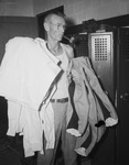 Albert Smith is with the Texas Christian University Horned Frogs athletic department. He has been a Frogs' trainer for fourteen yeas and is called "Mr. Chips". His arms are loaded with athletic wear as he goes about his duties. Mr. Smith is dressed in a t-shirt and trousers. He is smoking his pipe as works. Published in the Fort Worth Star-Telegram evening edition, September 10, 1941.