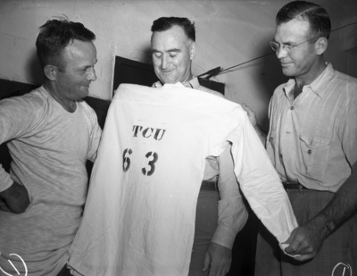 The Texas Christian University locker room is bustling with excitement as the Frogs prepare for the 1941 football season. Members of coaching staff left to right are Dutch Meyer, Hub McQuillan, and Mike Brumbelow. Coach Meyer is entering his eighth season as the head coach. He led the Frogs to Championships in 1935 and 1938. He is dressed in a long-sleeve shirt and trousers. The Frogs' newest coach, McQuillan from Texas A&M, pulled on his uniform for the first time. Mr. Brumbelow is dressed in a button-up shirt and trousers. Published in the Fort Worth Star-Telegram evening edition, September 5, 1941.