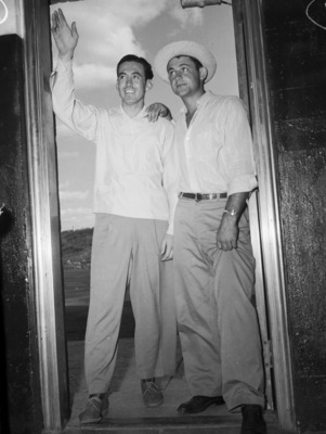 The Texas Christian University locker room is bustling with excitement as the Frogs prepare for the 1941 football season. A pair of veterans are shown waving from the doorway as they arrive for duty. They are left to right Leonard Pugh and Joe Rogers. Pugh is a 207-pound lineman from North Side High School in Fort Worth, Texas. He is dressed in a button-up shirt and trousers. Rogers is a lettered guard from New London, Texas. He is wearing a hat, button-up shirt with cuffed sleeves, and trousers. Published in the Fort Worth Star-Telegram evening edition, September 5, 1941.