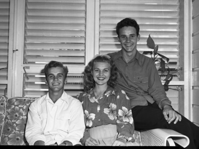Sitting on a couch left to right are Jerry Burke, Miss Bobby Jo Sanford, and Gerard Rostello. Mr. Burke and Mr. Rostello are visiting Fort Worth, Texas from Long Beach, California. Miss Bobby Jo Sanford is helping entertain the lads while they are in town. Published Fort Worth Star-Telegram Morning Edition September 8, 1941.