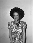Mrs. George W. Harrison has returned to Fort Worth, Texas after visiting her husband at Camp Polk near Leesville, Louisiana. She is standing against a wall wearing a wide brimmed hat, floral dress, and a necklace. She and her husband married on May 31, 1941. She is the former Miss Tom Alyce Cravens. Published Fort Worth Star-Telegram Morning Edition September 7, 1941.