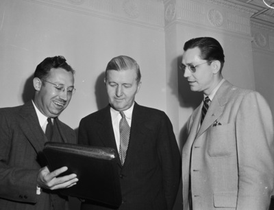 Hustlers Club State Reserve Life Insurance Company Convention. Left to right, B. N. Woodson, Hartford, Connecticut; E. E. Bewley, and Frank Ligon. Photograph showing three men wearing dress suits. They are standing beside each other in a row. The man on the left is holding a leather type notebook or case with a zipper. All three men are looking down at the notebook. Published September 6, 1941.