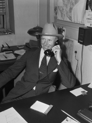 Walter Bell, county purchasing agent, on the phone in his office. He is sitting at a desk and is wearing a suit and hat. On the desk are various documents and a pencil. Behind him is a desk on which there are documents, a pen and a lamp.