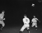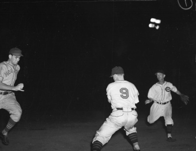 Walter Sessi, Houston Buffaloes player, far left, being tossed out by Jackie Reid, of the Fort Worth Cats, right, on a close play to Chuck Baron (center, back to camera). Sessi is shown running towards the plate. His jersey reads "Houston," across the front. On the back of Baron's jersey, there is a number nine.
