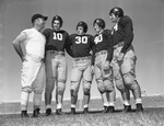 The Texas Christian University football team is preparing for their 1941 season. Coach Dutch Meyer is looking over his backfield, which he deemed the largest and fastest he's had in many seasons. The boys next to Coach Meyer left to right are Frank Medanich (10), Frank Kring (30), Kyle Gillespie (40), and Nolan Sparks (24). The group is standing on the football field, dressed in their uniforms. Coach Meyer is wearing a hat, t-shirt, football pants, and cleats. Published in the Fort Worth Star-Telegram morning edition, September 7, 1941.