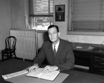 J. M. Star Williams, the new Tarrant County, Texas auditor, as he entered his new office for the first time. He is wearing a suit. Printed on the door to the office is the word "Auditor." Published in the Fort Worth Star-Telegram Morning edition September 7 1941.