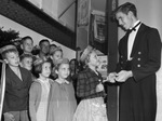 At the Twelfth Annual Big Time Party. Among the 10,000 youngsters who packed six neighborhood theaters Tuesday morning for twelfth annual Big Time Party given by Leonard's Department Store for school children were these early arrivals at the Tivoli Theater. Shown lined up to hand their tickets to Houston Moore, head usher, (far right), are Aurelia Ann Wall, Betty Alliene Wright, Ann Ellis, Averill, Betty Catherine Lackey, Ernest Colvin Lackey, Richard Denham, Eddie Denham and Claud Stewart. Each received candy and souvenir caps. Published in The Fort Worth Star-Telegram Evening Edition September 9, 1941.