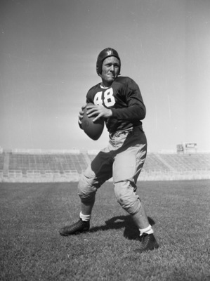 Emery Nix is a sophomore on the Texas Christian University football team. He is one of the most promising passers the Frogs have had in several years. In 1938 Nix skippered his Corpus Christi High School team to a state title. He is a good runner and an exceptional play selector. He is also the only married man on the purple squad this season. Nix is shown dropping back and setting to throw a pass. He is dressed in a number 48 football uniform. Published in the Fort Worth Star-Telegram evening edition, September 15, 1941.