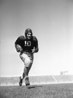 Frank Medanich is a sophomore halfback on the Texas Christian University football team. He is from Pecos, Texas and possesses great natural ability. During the off season, Medanich suffered from a mysterious illness. He had his tonsils and five teeth removed and dropped fifteen pounds. He is slowly returning to the field and is improving physically. Medanich is shown sprinting down the field with the football cradled under his right arm. He is dressed in a number ten football uniform. Published in the Fort Worth Star-Telegram evening edition, September 16, 1941.